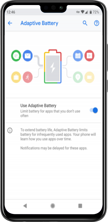 ฟีเจอร์สุดท้าย ได้แก่ ฟีเจอร์ ‘Adaptive Battery’ ตัวช่วยในการยืดอายุแบตเตอร์รี่ หมดปัญหาการพก แบตสำรองให้หนักกระเป๋า โดยฟีเจอร์นี้ออกแบบมาให้คุณสามารถเลือกการตั้งค่าปิดการใช้งานในบาง แอพลิเคชั่นที่ไม่ค่อยได้ใช้ให้อยู่ในโหมดหลับเพื่อไม่กินไฟแบตเตอร์รี่ ทำให้แบตสามารถทำงานได้นานขึ้นกว่าเดิม ไม่ต้องกังวลว่าแบตจะหมดระหว่างวันให้หนักใจ !