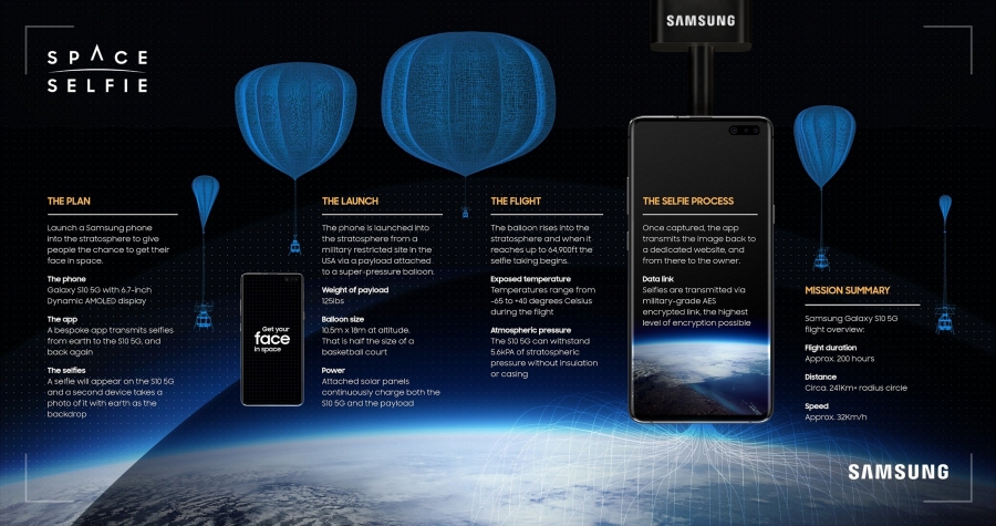 ซัมซุง กาแลคซี่ เอส 10 5G ที่บรรจุอยู่ในยานบรรจุ (Payload) จะถูกส่งขึ้นสู่สถานีอวกาศด้วยบอลลูนความดันสูงจากแท่นยิง ณ รัฐเซาท์ดาโกตา ประเทศสหรัฐอเมริกา ไปยังความสูง 64,900 ฟุต ซึ่งยานบรรจุนี้ถูกสร้างขึ้นมาให้มั่นใจได้ว่า จุดที่กล้องอีกตัวอยู่จะสามารถจับภาพที่ดีที่สุดของกาแลคซี่ เอส 10 5G พร้อมเห็นความโค้งของโลกและแสงสว่างจากดวงอาทิตย์ ปรากฏเป็นฉากหลังที่สวยงาม เพื่อให้ภาพถ่ายของผู้ที่ได้รับการอัพโหลดขึ้นไปในอวกาศผ่านทางเว็บไซต์ของโครงการ (Mission Control) จะได้ถูกบันทึกเป็นหนึ่งใน #เซลฟี่หลุดขอบโลก แล้วส่งกลับมายังเจ้าของภาพ