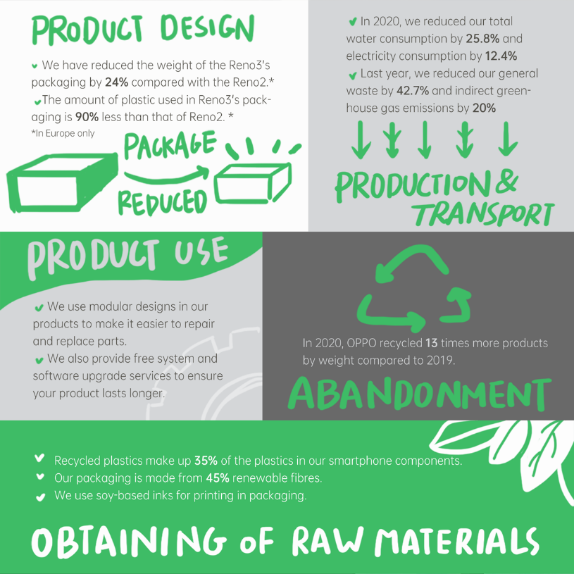 จากการเป็นส่วนหนึ่งของ circular economy หรือ เศรษฐกิจหมุนเวียน ทำให้ OPPO มีการรีไซเคิลผลิตภัณฑ์ที่เพิ่มขึ้นถึง 13 เท่าในปี 2563 เมื่อเทียบโดยน้ำหนักกับปี 2562 รวมถึงการมุ่งมั่นสนับสนุนการใช้วัสดุหมุนเวียนมากขึ้นด้วยการใช้พลาสติกแบบรีไซเคิล 35% ของวัสดุพลาสติกที่มีอยู่ในส่วนประกอบของสมาร์ทโฟน พร้อมกันนั้น บริษัทยังสามารถลดขยะทั่วไปได้ 42.7% และลดการปล่อยก๊าซเรือนกระจกทางอ้อมได้ 20% ในปี 2563