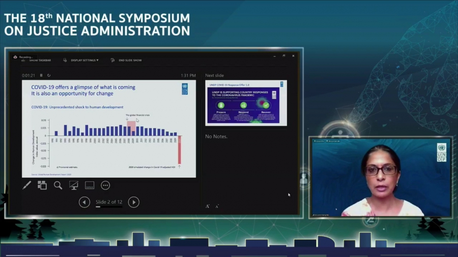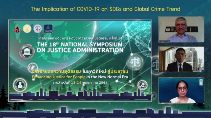โควิด-19 ของประเทศต่าง ๆ ซึ่งเป็นอุปสรรคต่อการบรรลุเป้าหมายการพัฒนาที่ยั่งยืน ในเวทีเสวนาคู่ขนานของการประชุมทางวิชาการระดับชาติว่าด้วยงานยุติธรรม ครั้งที่ 18 (The 18th National Symposium)