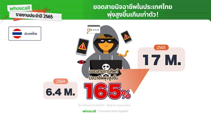 กรุงเทพฯ ประเทศไทย – 31 มีนาคม 2566: Whoscall ผู้นำด้านแอปพลิเคชันระบุตัวตนสายเรียกเข้าที่ไม่รู้จัก และป้องกันสแปม สำหรับสมาร์ทโฟน ชี้ถึงปัญหาที่เพิ่มขึ้นของการหลอกลวงทางโทรศัพท์และข้อความ SMS จากรายงานประจำปีพบว่า มีการหลอกลวงทั้งจากสายโทรเข้าและข้อความ SMS รวม 405.4 ล้านครั้ง ทั่วโลก แม้ว่าตัวเลขโดยรวมจะลดลง จากปีที่แล้ว แต่สำหรับประเทศไทยการหลอกลวงยังคงเป็นปัญหาที่สำคัญอย่างยิ่ง คนไทยยังต้องรับสายจากมิจฉาชีพเพิ่มขึ้น 165% หรือ 17 ล้านครั้งในปี 2565 รายงานยังเผยสถิติสำคัญครั้งแรก ถึงจำนวนการรั่วไหลของเบอร์โทรศัพท์ในประเทศไทยกว่า 45% หรือ 13.5 ล้านเบอร์ การรั่วไหลของเบอร์โทรศัพท์เป็น ปัญหาสำคัญทั่วโลก รวมถึงการหลอกลวงทางข้อความ SMS ยังคงระบาดอย่างต่อเนื่อง