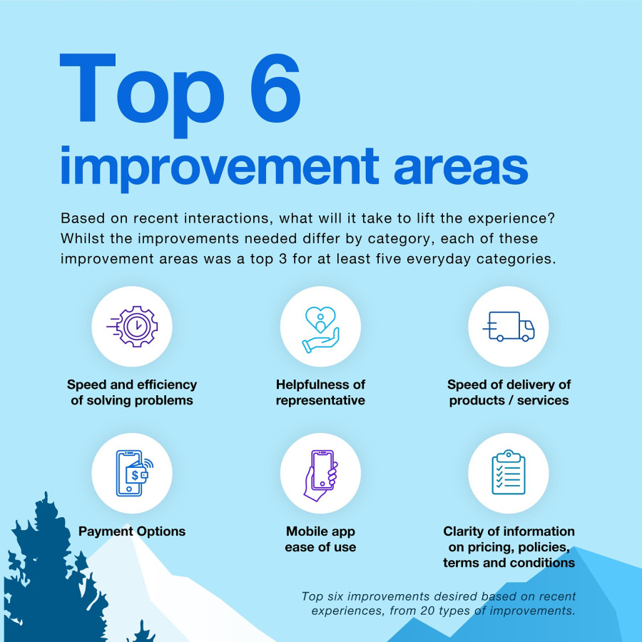 สิ่งที่ผู้บริโภคต้องการให้ปรับปรุงมากที่สุดคือ ตัวเลือกการชำระเงินผ่านระบบดิจิทัล และแอปฯบนมือถือที่ใช้งานได้ง่ายยิ่งขึ้น โดยเฉพาะในหมวดที่ต้องใช้งานผ่านช่องทางดิจิทัลอย่างการจัดส่งอาหาร ธนาคาร และร้านค้าปลีกออนไลน์ ส่วนการพัฒนาการบริการจากเจ้าหน้าที่ เป็นสิ่งที่ลูกค้ามองหาในอุตสาหกรรมอย่างสายการบิน ยานยนต์ และบริการด้านสุขภาพ